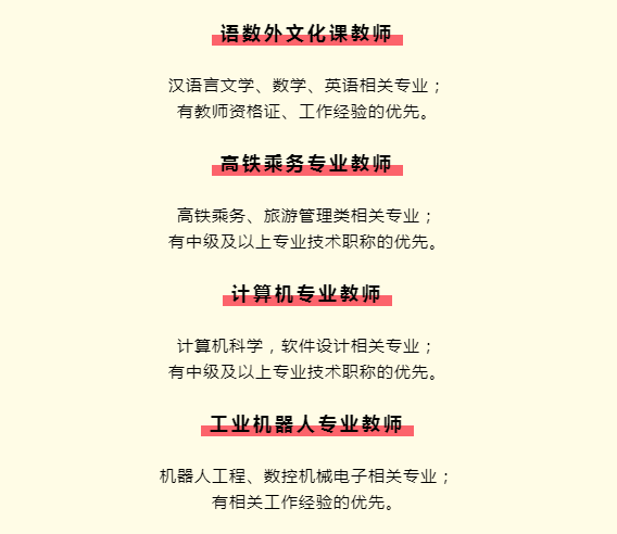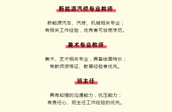 2、全日制本科及以上學歷,具備相關(guān)學科中學或中職教師資格(專業(yè)課可適當放寬條件)。
