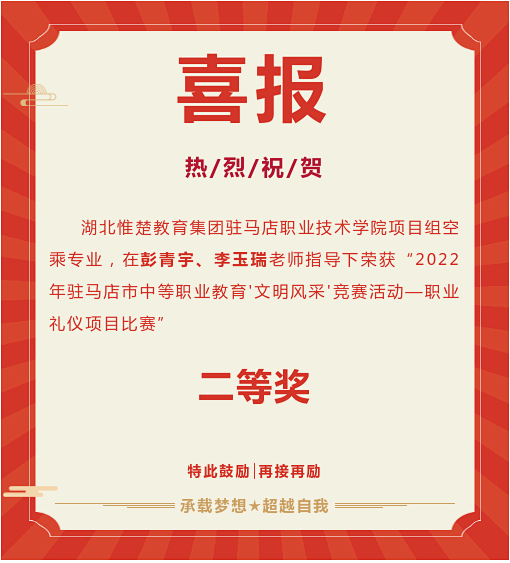 2022年9月21日,由駐馬店市教育局主辦,河南省駐馬店市農(nóng)業(yè)學校承辦的“2022年駐馬店市中等職業(yè)教育‘文明風采’競賽活動”緩緩拉開序幕。惟楚教育駐馬店職業(yè)技術學院項目組空乘專業(yè),由彭青宇、李玉瑞老師帶領曾陽陽、陳怡名、呂薇、張文婷、周華明、孔情緣,這六名優(yōu)秀的學生參賽,最終在“職業(yè)禮儀項目比賽”中榮獲二等獎。