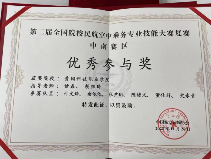 11月26日,第二屆全國院校民航空中乘務(wù)專業(yè)技能大賽中南區(qū)復(fù)賽在滁州·華東航空實訓(xùn)基地圓滿落幕,因疫情原因,黃岡科技職業(yè)學(xué)院校區(qū)旅游與航空服務(wù)學(xué)院民航空中乘務(wù)專業(yè)的學(xué)生未能線下參加,只能通過有限的條件參加線上比拼,最終獲得優(yōu)秀獎。