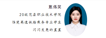 焦偉笑,女,商丘市虞城縣人,就讀于濮陽職業(yè)技術(shù)學(xué)院高速鐵路乘務(wù)專業(yè)。在校期間品學(xué)兼優(yōu),榮獲2021學(xué)年國家獎學(xué)金、榮獲2022學(xué)年“三好學(xué)生標(biāo)兵”稱號、榮獲2022年“優(yōu)秀志愿者”證書、榮獲2021學(xué)年“優(yōu)秀三好學(xué)生”稱號、獲得2021學(xué)年“優(yōu)秀共青團(tuán)員”稱號、榮獲2020學(xué)年“優(yōu)秀先進(jìn)個人”稱號、榮獲2022學(xué)年“首屆大學(xué)生茶藝表演最佳氣質(zhì)獎”、榮獲2020級“高鐵乘務(wù)禮儀實訓(xùn)大賽第一名”等榮譽。